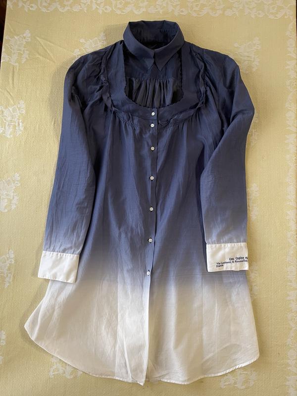 Длинная блуза красивого сине-белого цвета. Фирмы Georgie -Portugalia. Размер 38, на спине можно стянуть. Глубокий вырез и застежка по отдельности, как в рубашке. Мерки: длина по спинке 85; рукав 58.5; плечи 41; ширина подмышки 51 ( но можно стянуть до37) ширина низа 64; вит18 см. Если ваш размер 38, то она идеально подойдет вам. Состояние блузки как новая