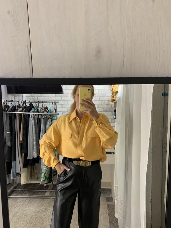 Прекрасная яркая блуза из 100% шелка! Состояние новой, следы ношения отсутствуют! Принт схожий на гусячу лапку! Имитация накладных карманов! Размер XL Плечи 46, по груди 58, бедра 60, рукав 57, длина 71 см