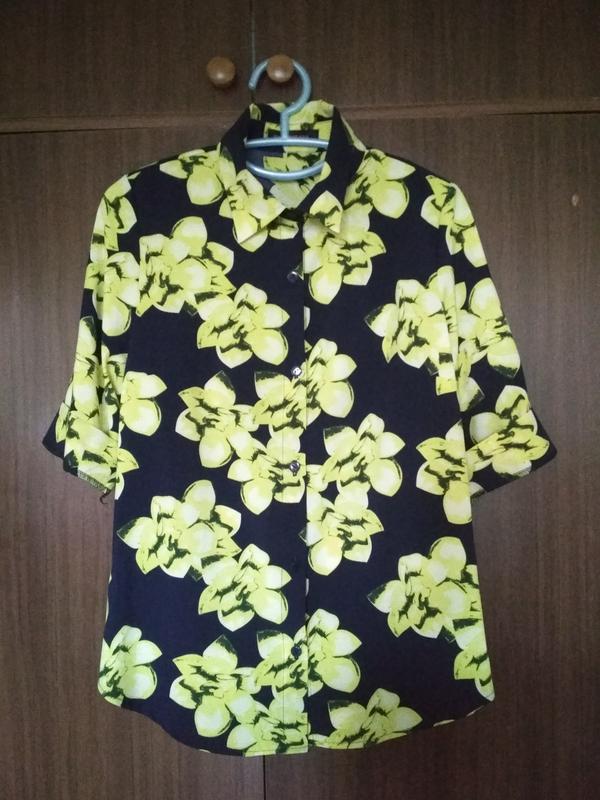 Срочно разбираю шкаф в связи с переездом!!!🚛🚛🚛 Очень крутая новенькая блузка из приятного наощупь, лёгкого материала, похожего на шелк. Цвета яркие, насыщенные, жёлтые цветы на темно-синем фоне. Смотрится очень элегантно, несмотря на яркий принт. Длина по спинке от воротника 65 см, от подмышки по боковому шву - 35 см. Расстояние между подмышками - 45 см. Почти не мнется!!! Где-то потерялась одна пуговичка, поэтому такая цена 👛 Смотрите также другие мои объявления, есть много чего интересного!🤗👗🎽👞🥿👠👕😍