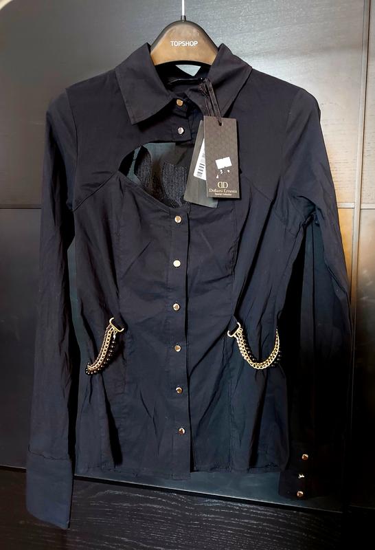Красивая оригинальная блузка. Имеет красивую полупрозрачную спинку и вырез над грудью. Пуговицы расстегиваются. Размер S-М, 44-46. Полная длина по спинке 63см+4см воротник, между подмышками 41см, ширина по талии 35см, ширина по бедрам 40см, плечи по швам 34см. Замеры в нерастянутом состоянии. Ткань красиво тянется. Отправлю по почте по полной предоплате или безопасной доставкой Нова. Отправлю по почте по полной предоплате или безопасной доставке.