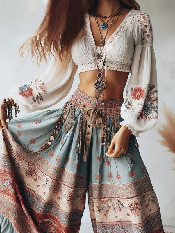 Блузка в стиле бохо с длинными рукавами. Укороченный топ в этническом стиле с цветочным принтом, V-образным вырезом, на шнуровке, весна-лето-осень
