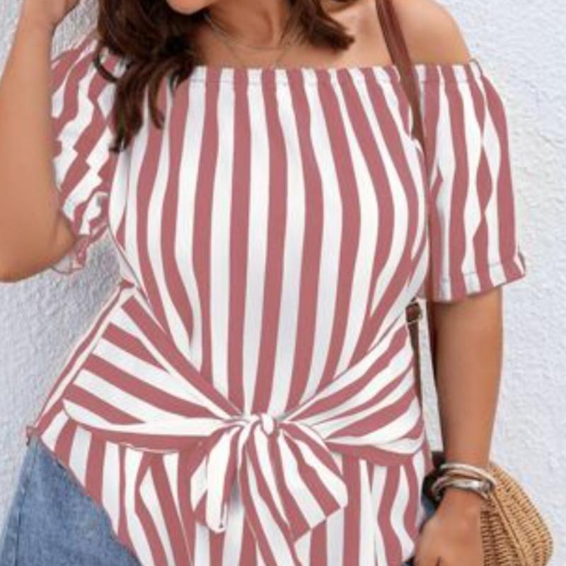 Летняя блуза большого размера.В горловину вшита резинка, можно опустить на плечи..в районе талии по бокам вшит широкий поясок, который можно завязывать по разному рукав на резинке, с воланчиком. грудь-67 длина -65 рукав-24