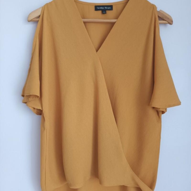 Блуза большой размер.Горчического цвета.Имеет широкий рукав, в них есть прорези.Ззади блуза идет немного длиннее, спереди короче.Груды-82 стегна -60 длина спереди -60 сзади -66 рукав 40