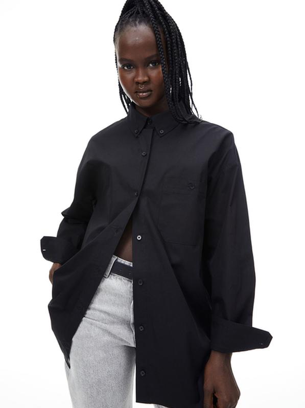 Рубашка оверсайз из плотного хлопкового поплина с воротником на пуговицах, пуговицами спереди и кокеткой сзади. Заниженная линия плеча, длинные рукава с манжетами на пуговицах, накладной нагрудный карман на пуговице и закругленный низ. Состав 100% хлопок Размер S ОВЕРСАЙЗ Обязательно ориентируйтесь только на замеры! Полуобхват пояса - 60 см. Плечо 20 см, Длина рукава - 52 см. Длина изделия - 76 см. Ширина по плечам - 56 см. Объем груди - 120 см.