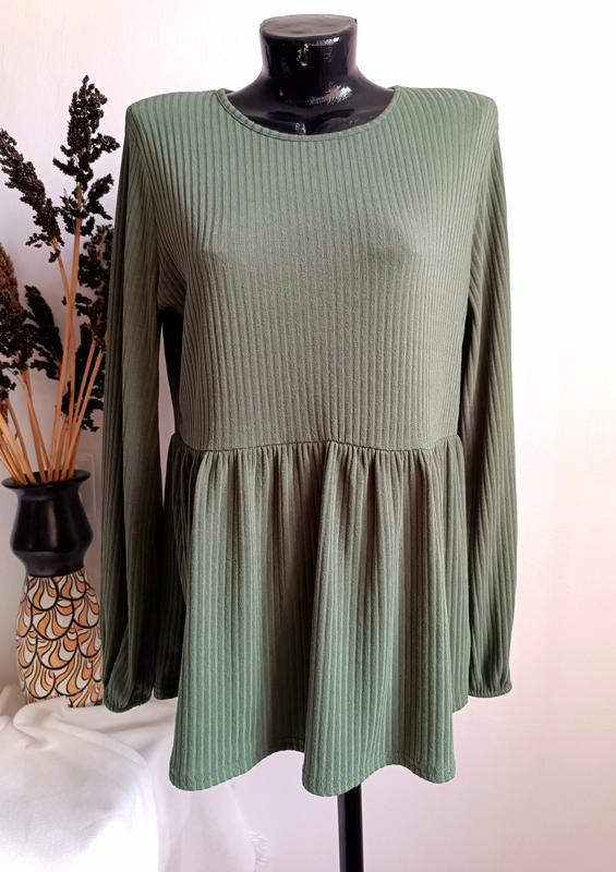 женская блуза в рубчик на длинный рукав с баской, оливкового цвета размер указан 42, но ориентируйтесь по замерам плечи 40 см ПОГ 52 см ПОТ 40 7 см ПОБ 68 см длина 68 см длина рукава 62 см ширина рукава в бицепсе 15 см 96% полиэстер 4% еластан ткань очень хорошо тянется