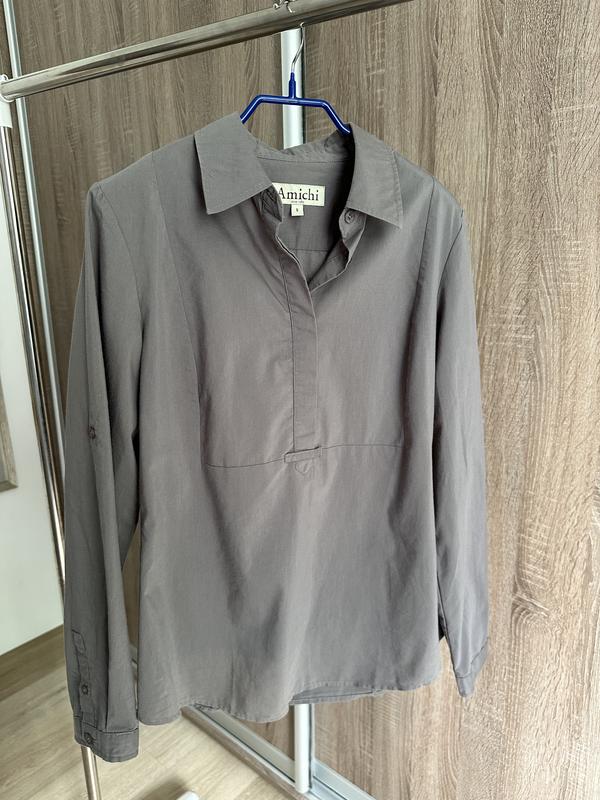Блузка серого цвета, с воротничком на пуговицу, рукав можно укорачивать и фиксировать. Размер S В идеальном состоянии