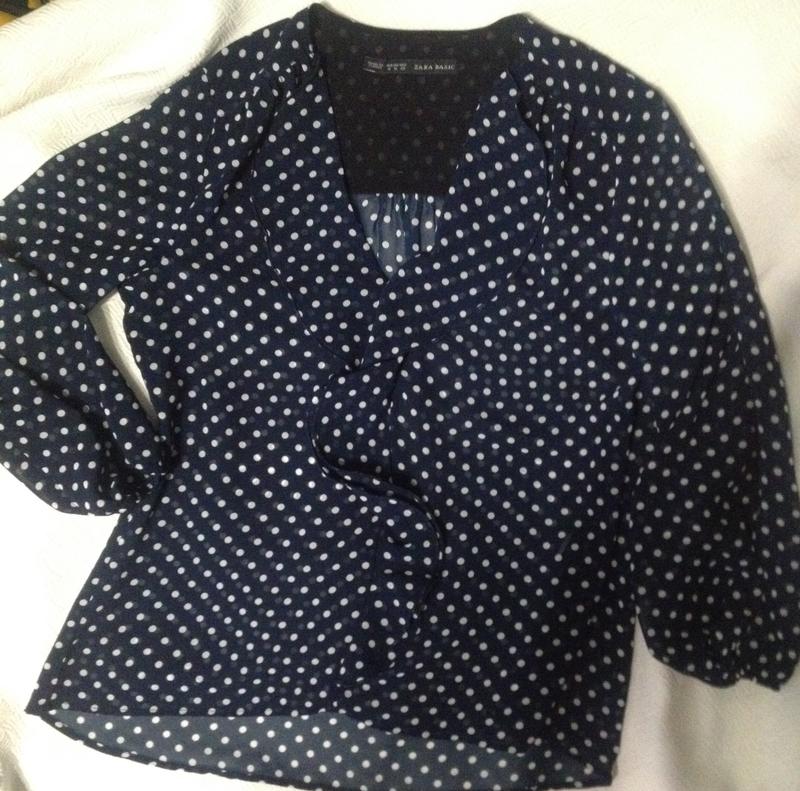 Воздушная блузка в горошек ZARA. Очень легкая приятная ткань, невесомая, полупрозрачная. Совсем не мнется. Состава ткани нет. Рукав внизу собран на резинке. Цвет темно темно синий в белый горох. Можно на 44-46 р ПОГ - 50 см плечи - 42 см длина - 66 см длина рукава - 53 см