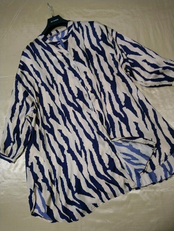 Шикарная женская блуза удлинённая оверсайз большой размер великолепного качества (вискоза шёлк) принт абстракция на пуговицах небольшие боковые разрезы состояние идеальное Италия Пог 77-78 Плечи 67 Рук 42 БЕДРА 81-82 ДЛИНА 93
