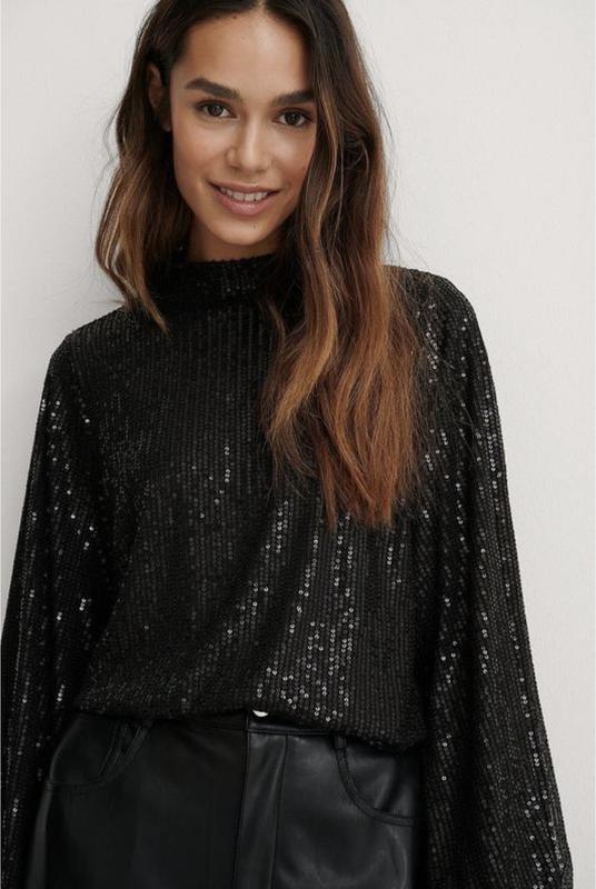 Топ из сетки, вышитой пайетками, с воротником-стойкой и длинными рукавами. Подкладка из трикотажа. Черного цвета В идеальном состоянии Размер S чашистать и на M Замеры Длина 52 Рукав от горловины 66 ПОГ 57