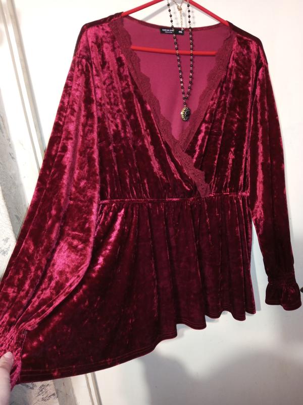 Роскошная, бархатная-велювая стрейч, вечерняя-нарядная блузка на запах, с пышным-объёмным рукавом, мега батал, SHEIN. Цвет- красный с отливом в вишнёвый. Размер на бирке 4XL, одела на свой evr 52 -шикарно, подойдёт и на больший, и на меньший, только смотреться будет по-разному, но ориентируйтесь по условным замерам: ПОГ по спинке -59см + очень тянется-ориентировочно до ПО 80см; ПОТ на резинке - 49/79см; ПОБ-условно-75/100см, ПО по канту - 96см +++; длина от плеча -72см; длина рукава - 61см, манжет на резиночке; ПО бицепса 23/36см; ПО проймы - 31см За счёт баски или оборки - отлично камуфлирует живот, стройнит. Одета пару раз, женственная, стильная..., конечно, если Вы -любите такие вещи. Девушки,пожалуйста,переспрашивайте-сделаю дополнительные фото и замеры.Возврата нет-объявления платные. См.др.объявление-есть аналогичные,длинные,нарядные,вечерние платья, блузы,а также 90% одежды большого размера. Подписывайтесь-каждый день обновления одеждой больших размеров не только. Покупая несколько товаров -Вы экономите на пересылке,лоты комбинирую в одну посылку. Перед покупкой -просьба: ознакомиться с рубрикой "ОБО МНЕ" Состав: 95% полиэстер; 5% эластан Доставка: Перешлю в др.города за Ваш счёт-при полной оплате на карточку