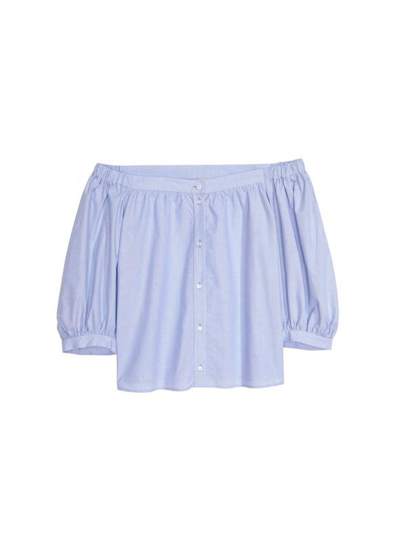 Блуза прямого кроя с открытыми плечами из воздушной хлопковой ткани с эластичными плечами, пуговицами спереди и рукавами-баллонами длиной 3/4 с манжетами. Возможно повреждение бирки 0607670_гол.пол_07