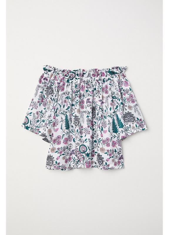 Блуза с открытыми плечами из тканого материала с резинкой по верху и короткими рукавами. Возможно повреждение бирки 0622043_цветы_05