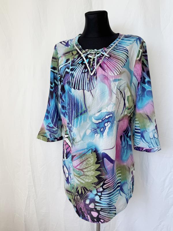 Peter hahn шелковая блуза яркая туника винтаж пляжная летняя полупрозрачная удлиненная блу...