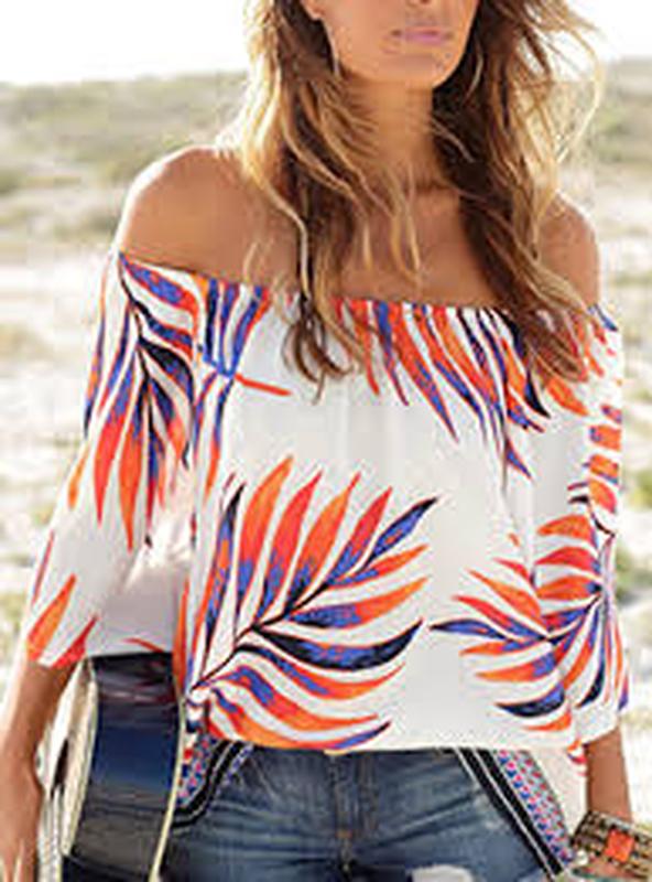 Блуза-топ LASCANA із відкритими плечима вільного крою з широкими рукавами реглан. Принт: візерунок тропічного листя з яскравими кольорами, включаючи відтінки оранжевого, червоного, синього та фіолетового на білому тлі. Довжина 46м. Склад 100% віскоза, нова.