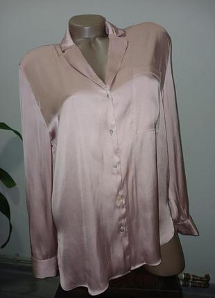 Блуза рожево-персикового кольору на ґудзиках, зпереді є кишенька. Атлас, без затяжок. Довжина по спині 67 см. Рукав 60 см плече 13 см Пог 55 см 100% полієстер