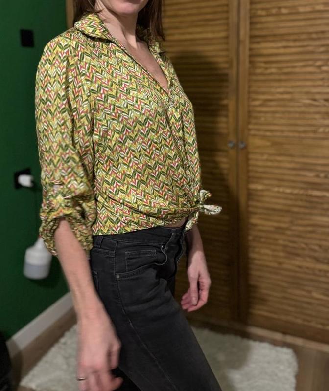 Італійська віскозна блуза. Комір класичний сорочковий. Застібка на гудзиках до низу. Рукав довгий з можливістю підбирання, підкреслює розслаблений вигляд.. Зв’язка спереду додає невимушеності та створює чіткість. Зигзагоподібний візерунок із дрібними повторюваними формами в зелених, жовтих, червоних тонах з акцентами білого, надає текстурованого живого та теплого вигляду. Розмір не вказаний, тому орієнтир на заміри. Заміри: ШП 45, ПОГ-46, довжина 50см. Модель розмір S, зріст 170см.