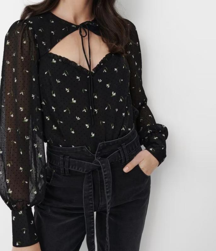 Блузка черная с цветочным белым принтом, с завязкой mohito. Размер 36 - размерная сетка последнее фото❣️