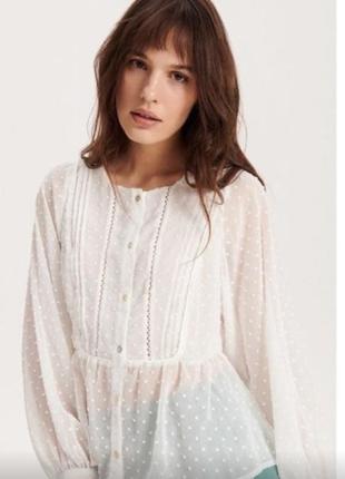 Новичка блуза с красивыми полупрозрачными рукавами в капленке и декорирована вытачками, перламутровыми пуговицами и легкой баской. Указан размер xl, подойдет и на м-l