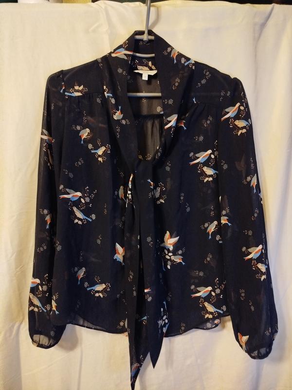 Блуза женская шифоновая с имитацией галстука. Цвет - темно-синий с принтом. Размер S-M.