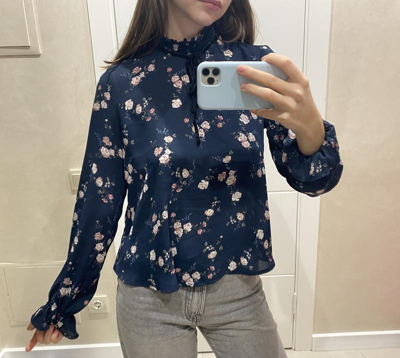 Блуза H&M в цветочный принт темно-синего цвета. Стан идеален. Укороченная, размер XS. На все товоры в профиле 1+1=3