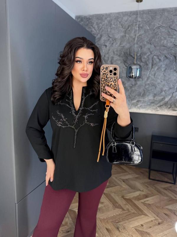 Блуза Арт 1178 -111б Тканина трикотаж креп дайвінг, оздоблення термокаміння Колір чорний, білий, червоний Розмір 48-50,52-54,56-58