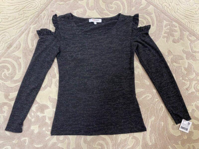 Блуза черная с серебристой люрексовой нитью, размер ХС указан, между рукавом и плечом разрез и обшит рюшами. Длина - 54см, плечи - 41см,рукав от плеча - 47см, пог - 41см, пот - 38см, поб - 44см.