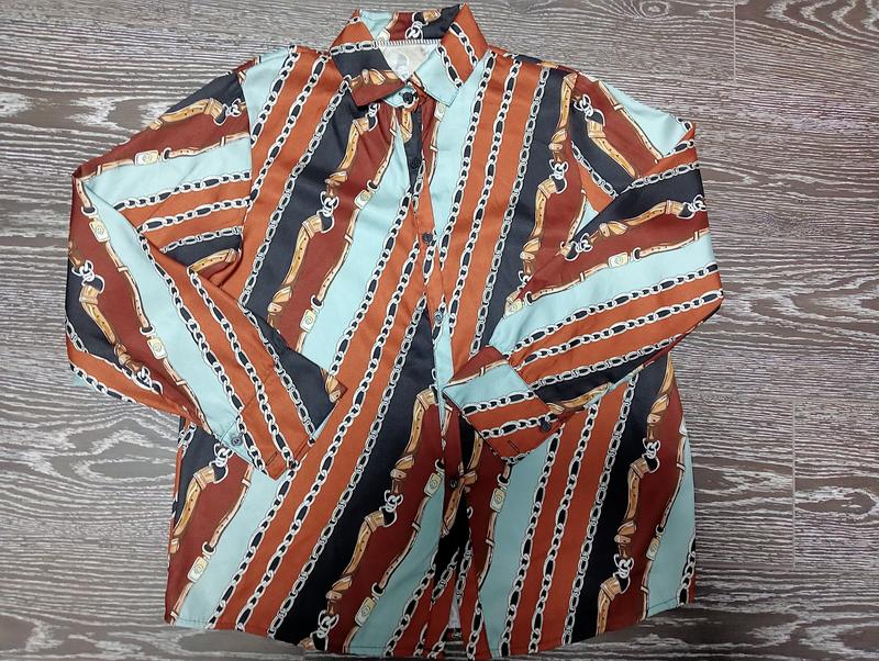 шикарная атласная блуза в трендовый принт -цепочки на М-Л замеры ог 56, длина 67см