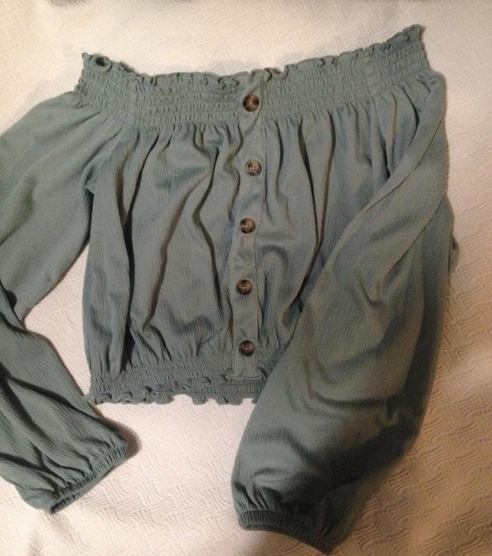 Коротенькая блузка по пояс примерно с длинным рукавом. Более правильный цвет серо мятный шалфейный на первом, втором фото. Ткань жатая, манжет рукава на резинке тоже. Горловина и низ тоже. Позволяет сделать открытые плечи длина блузы -35 см длина рукава от резинки - 57 см