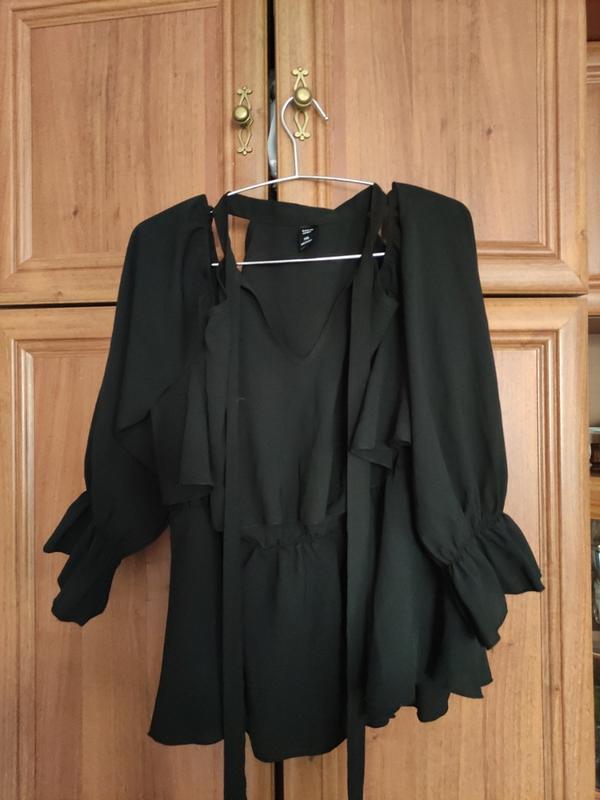 Летняя блуза в размере 1XL черного цвета с открытыми плечами, на шее есть завязки, снизу рукава и на талии резинка