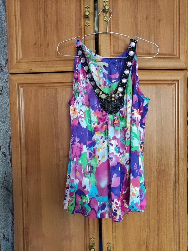 Летняя блуза в интересном принте по горловине обшита бисером и камнями