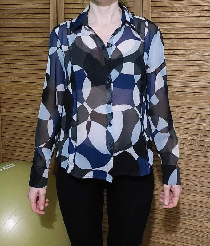 Шифонова біло сіро голуба блуза. Одягнута на розмір S, зріст 170м. Заміри ШП 44, ПОГ 52, довжина 62, довжина рукава 61см.