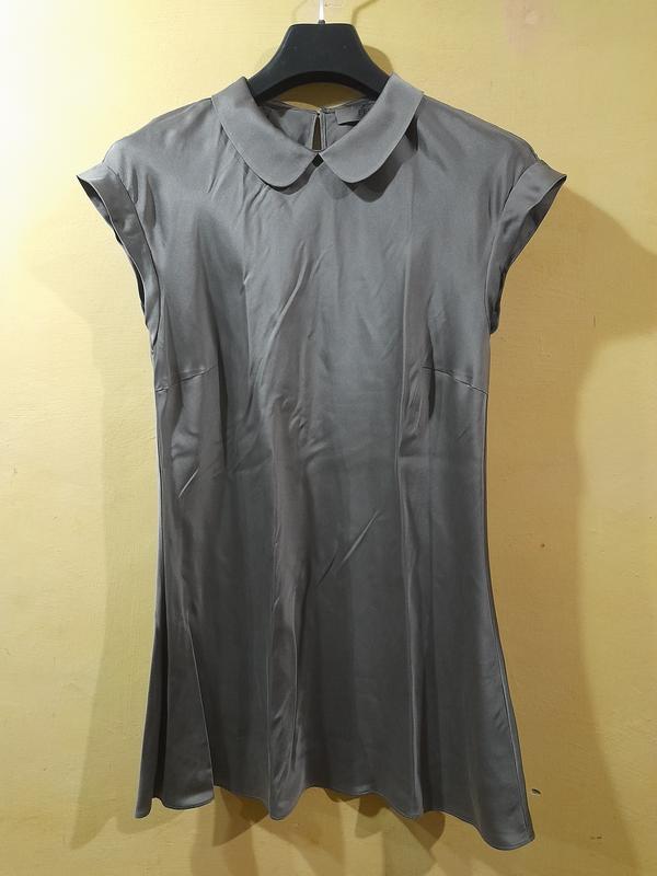 Очень красивая шелковая блузка с воротничком, стального цвета. В идеальном состоянии. В материал немного добавлена эластана, поэтому блузка тянется. Застегивается сзади на пуговицу. Материал: 94% шелка, 6% эластана. Размер: 38/М Замеры: Пог: 45 см. в спокойном состоянии, растягивается до 54 см. Длина: 74 см. Усчитайте, что блуза эластичная. За счет этого она будет короче. Плечі: 44-46 см.