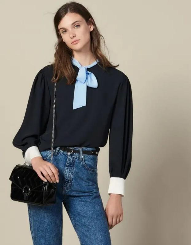 Блуза Sandro з бантом SFPTO00247 - розмір 2 -Застібка спереду на один гудзик -Манжети на одному гудзику -На плечах невелика резинка Матеріал: 100% поліефір. Ґудзики: 100% перламутр. Комір: 100% шовк. Манжети: 100% віскоза. 7600034771339