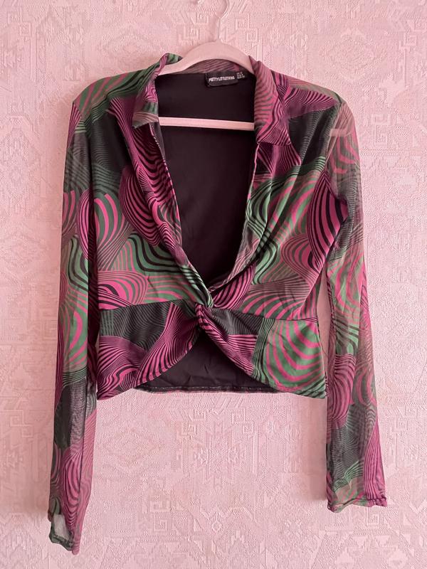 Кофта сетка на подкладке (кубковая прозрачная) с геометрическим принтом. Фирма PLT, размер по бирке 12/8/40. Декольте и декларативный узлы на талии. Замеры ОГ 90-96 ОТ 65-70 Длина рукава 64 Длина изделия 51