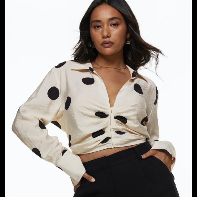 Пропоную модну блузу від відомого європейського бренда H&M. Коротка приталена блуза з віскозної тканини. Має комір і глибокий розріз спереду. Приховані ґудзики та складки спереду створюють ефект зібраного світла. Злегка спущені плечі, довгі рукави і широкі манжети з розрізом і ґудзиком. Склад: 84% віскоза,16% поліамід Розмір М. ЗАМІРИ: Напівобхват грудей - 48 см Напівобхват талії - 39 см Ширина по плечам - 40 см Довжина рукава - 60 см Довжина загальна - 43 см Колір - молочний в чорний горох. Блуза дуже стильна та ошатна. Стан - відмінний.