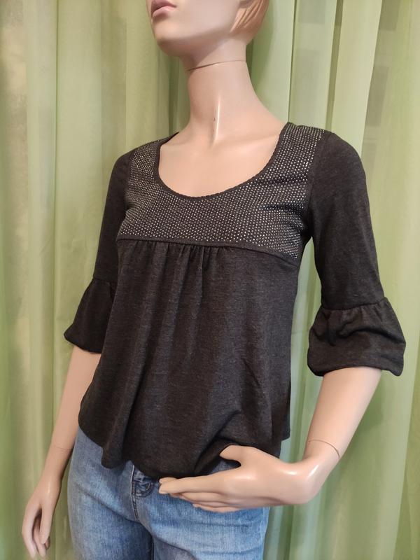 Блузка темно-сірого кольору, трикотажна , S. Довжина виробу 50 см , півколо грудей до 44 см , розширена до низу , рукав 3/4 38 см .