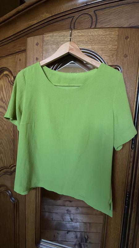 Блуза красивого цвета и прекрасной тканью с коротким рукавом. Имеет маленькую дырочку на затылке внутри изделия, которую при носке не будет видно