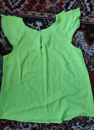 Хорошая легкая блузка яркого цвета лайм. Интересный трехслойный перчатки. Сзади застежка на пуговицу. Спереди у шейки капля. В груди полуобхват 50 см Длину сложно примерить, потому что перчатки выше шеи. Поэтому меряла от рукава, 62 см.