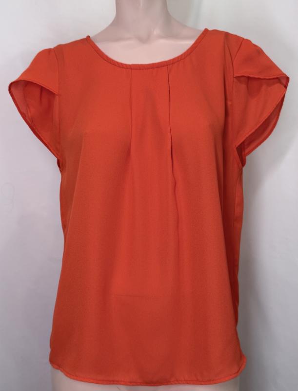 Стильная женская блуза ярко-помаранчового цвета. Легкая, приятная к телу ткань, короткие рукава и округлый вырез. Удобный свободный крой с декоративной сборкой спереди. Застегивается на пуговицу сзади.