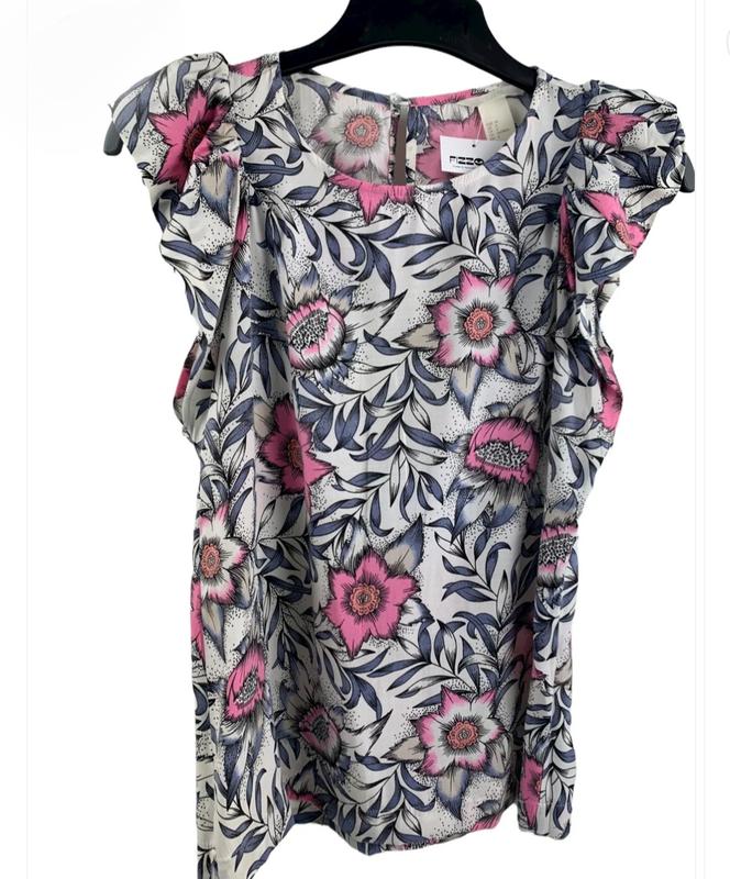 Легкая блуза с цветами По плечу красива зборка. На спинке застегивается на пуговицу. Состав материала: 50% вискоза, 50% полиэстер. Размер: M-L Длина 62,5 см. Полуобхват груди 49 см.