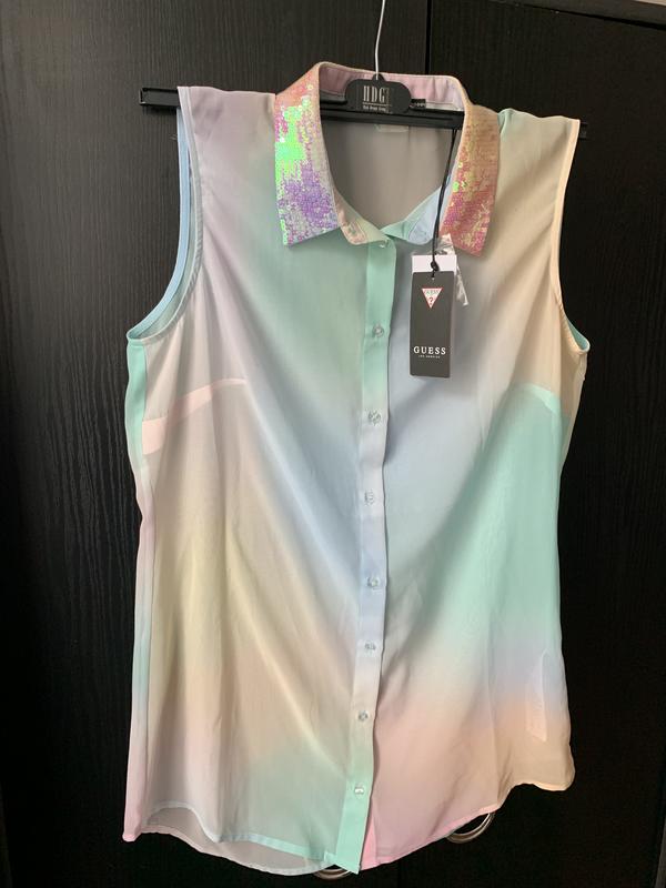 Цветная блузка, воротник в пайетках. Верхняя пуговица с камешками, окончательные guess. Длина 70 см, ПОГ -48 см, ПОБ -50 см. В районе талии с одной стороны есть затяжки, но на фото не видно. Последнее фото