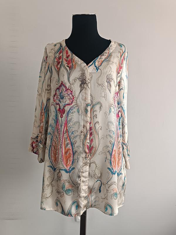 100% вискоза , длина 71 см, рукав 3/4 - 46 см, ширина под руками 46 см, ширина в талии полуобхват 43 см, ширина в бёдрах полуобхват 48 см Отправка Новой Укрпочтой Meest Розетка Безопасная оплата.