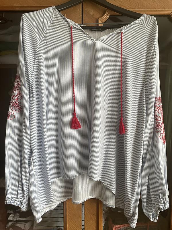 Блузка легенька, красивезна вишивка на рукавах. Длина 60/ сзади 67 Груди 68 Низ 70 Рукав 68 Бицепс 21 Читайте описание обо мне 🫶🏼