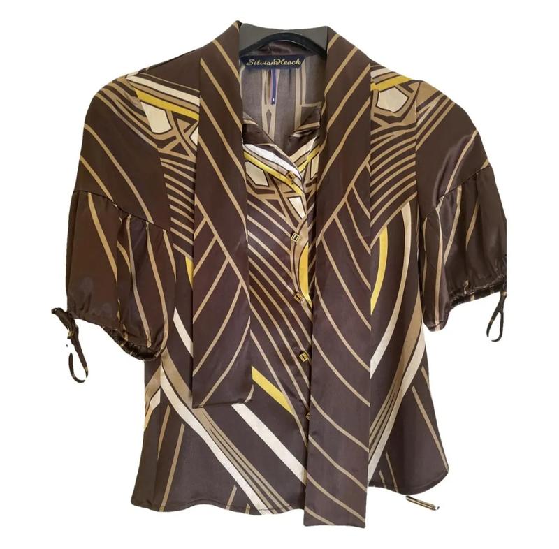 на этикетке указан М, идет и на с и м, зависит от пог Шоколадно-золота блуза с коротким рукавом и бантом Silvian Heach Италия, пуговицы золотистые Красиво лежит по фигуре.В жизни красивее. 96% полиэстер 4% эластан