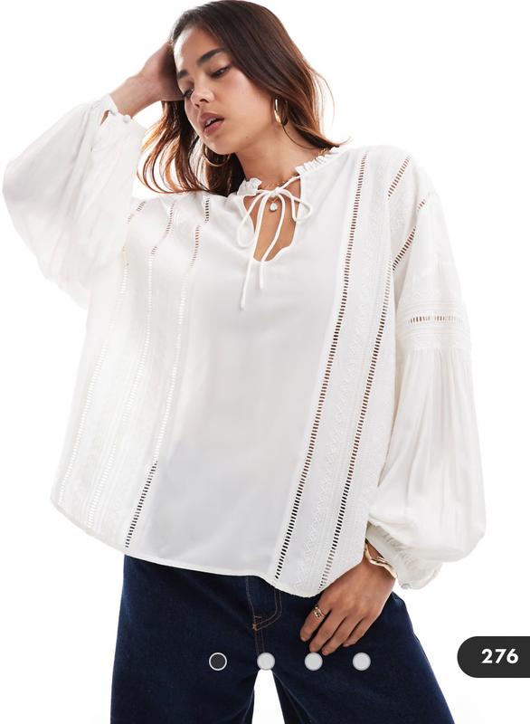 Белая натуральная объемная блуза с вышивкой и воротником с завязкой белого цвета вышиванка