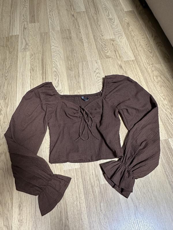 Коричнева кофта/блуза (S) — 300 грн Жіночна та стильна кофта з рукавами-кльош і зав’язкою на грудях. Чудово підкреслює фігуру!