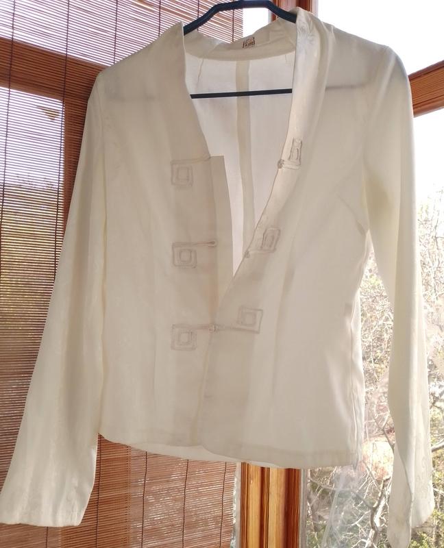 блузка белая кремовая С М 10 на ог 90 см. атласная мягкая тонкая, китайский стиль, гобелен узор, пуговицы высылаю из запорожья. пересылка уп, нп, рз. по товару вопросы в чат