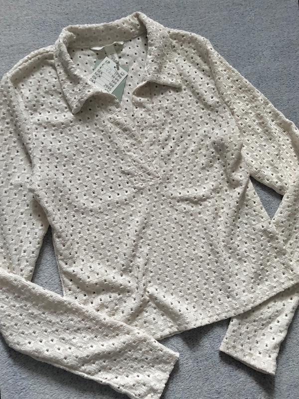 Блуза из мягкого трикотажа с перфорацией, в новом состоянии, без дефектов. Длина 48 см, Ног. 41 см, Нот. 35 см, Плечи 35 см, Длина рукава от плеча 61 см.