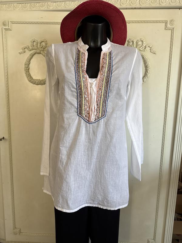 Нежная батистовая блуза от Emily Van den Berg. Цвет белый, расшитый бисером,бусинками-очень красиво! Склад:бавовна-100/. Размер по набору-36. Замеры: длина-73 см, ПОГ-44 см, ПОБ-47 см, рукав-60 см. Превосходная!