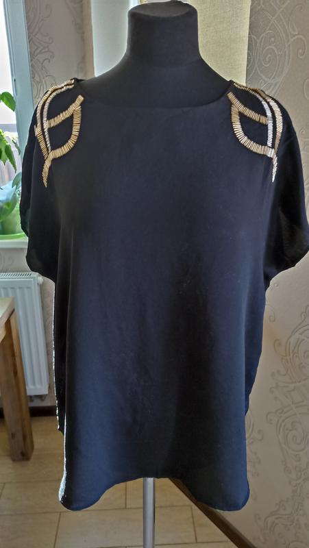 Легкая блузка черного цвета с опущенными плечами, без рукавов. Имеет отделку из бусин -трубочек с эффектом состарения. Замеры : длина по спинке -64см, пог-56см, к низу прямая Бочки округлены и немножко короче.
